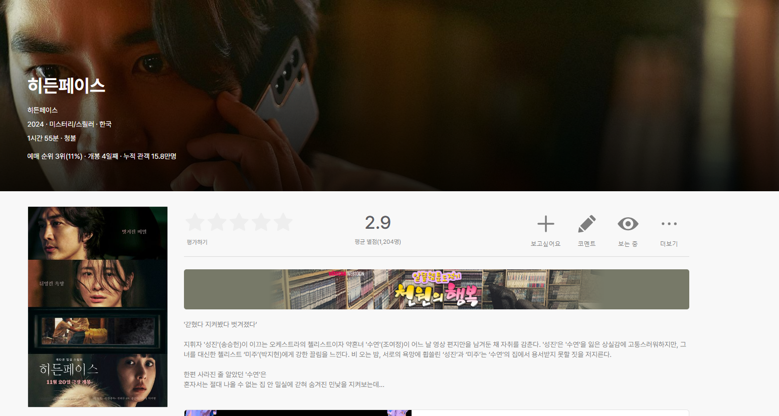 지금까지 "영화 히든페이스 관람평 & 예고편 공개! 출연진 정보, 평점, 포토까지 총정리 (후기 포함)" 포스팅 이었습니다. 감사합니다.